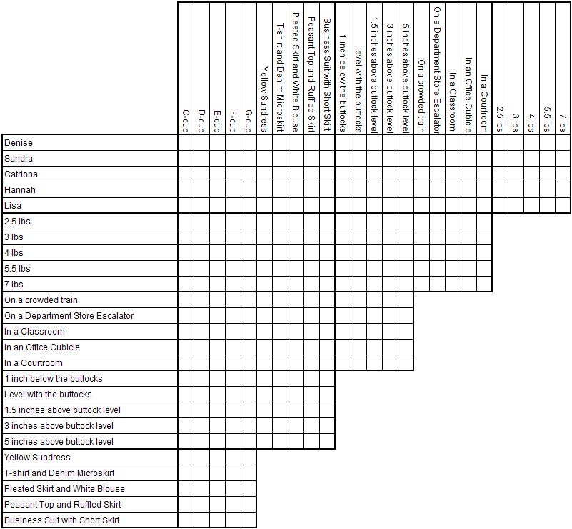 On a sunny day in London, England, five unrelated girls had highly embarrassing accidents, filling their panties with poo before they had time to get to a toilet. By reading the clues below, see if you can match the girls to their breast sizes, outfits, skirt lengths, locations, and poo sizes. To help you, at the bottom of the page is a chart that you can print out and fill in as you go.