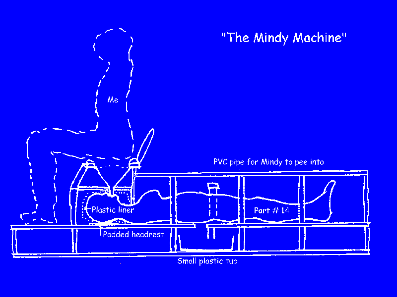 Guy continued the construction the next day. The machine had a compartment under Mindy's ass for a small Tupperware tub to slide into. Guy forced a section of 1-inch PVC pipe up into Mindy's asshole, connecting it to a 45-degree angle pipe that drained into that tub. He then and slid a catheter up Mindy's peehole and connected it to the top of that angle pipe with caulk. For good measure, though it was mostly unnecessary, he spot welded several metal straps around her arms, legs, and torso, and ensured they were bolted to the wood bulkheads and crossbeams.