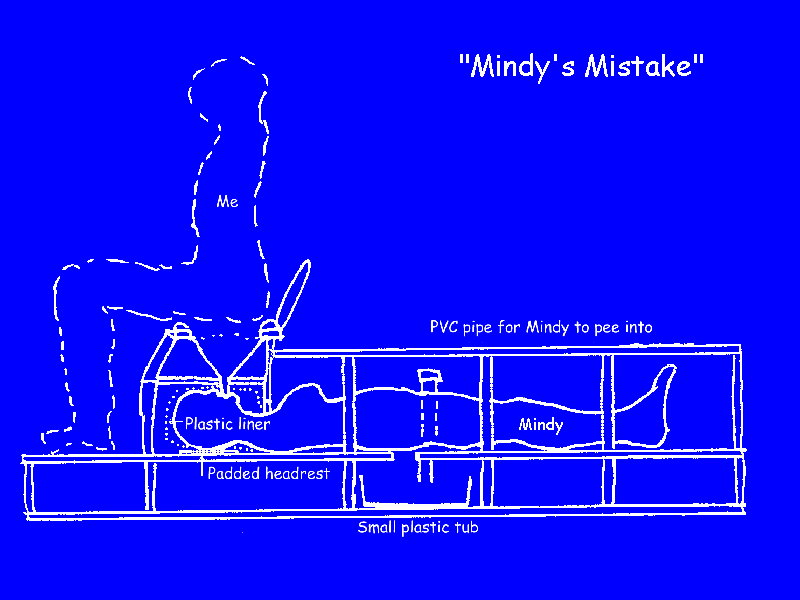 Then I found that PVC pipe and slit it between my legs into a slot in the platform into the Tupperware tub below. Its purpose was suddenly obvious. A slit cut into the pipe pressed against my sex so that I could relieve myself into the Tupperware tub below. The hole in the platform under my behind was large enough so that I could also do poo-poo into the tub.