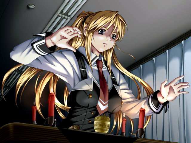 As Saeki intoned the last word, she made the sign of the cross. That seemed odd, but a second later she picked up a dagger from her desk. I thought she must have gone crazy. Bringing a weapon like that to school would get her expelled for sure! Imari clutched my arm as we watched the blonde girl prick her finger with a soft gasp. It must have been a serious cut as I could see crimson drops of blood falling to the floor. Only a few made it that far, however, as Saeki held her hand over a bronze cup sitting on her desk.