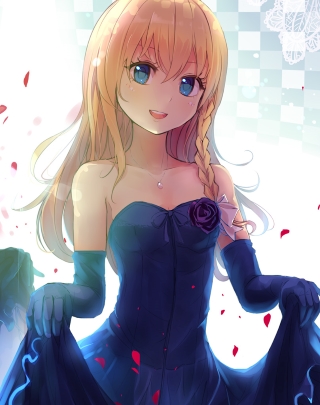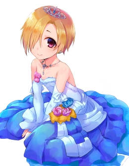 Evening sunlight illuminated the vision of my lovely daughter in a golden glow, hair curled and perfectly woven around a sparkling jewelry headpiece, adorned in an elegant strapless deep-blue ballroom dress. It fit perfectly, wrapping around her torso, supported by a muted band of lighter blue just above the waist with a ruffled faux-corsage sewn in. The skirt was a complex affair of several layers, with rose-like decorations and ruffles cascading in an angular pattern, trailing very slightly.