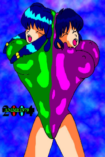 But it was too late. Her swimsuit was already beginning to turn green, and her arms were being pulled into the suit. She cried out and closed her eyes in a vain attempt to stop Akane from emerging. A purple-clad Akane began to force herself out of the back of Shampoo. First to emerge was her purple-clad breasts. Then her determined head emerged from out of the back of Shampoo. Soon the pair of them made up the same two-headed, two-legged beast they had been before. Minutes passed as both of them struggled for dominance.