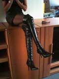 I woke up. The sun was coming in, and I was in a strange small bedroom. I heard a noise and turned. Amanda was sitting on the dresser lighting a cigarette. She was wearing a black minidress and form-fitting boots that covered her legs from her toes to above her knee.