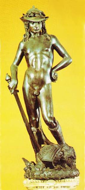 Speaking of feminine boys, the second most famous David, the one by Donatello, turns the founder of Israel into a little girl with a foppish feminine hat. The only thing masculine is the genitals that seem stuck on a girl's body with the pooching abdomen and pointy little nipples. 35 years or so later, Verocchio made another David obviously influenced by Donatello. Verocchio puts his girlsh David in a skirt and breastplate that seems to highlight his pubscent breasts and feminine abdomen. Again, all ages are admitted to the Bargello museum and you can find these in every book on the Italian art of the renaissance. No community standards were violated. Even the Christians aren't incensed that David has been turned into a girl. This art is okay.