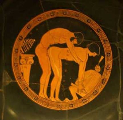 All of the ruckus over Jerry Sandusky would not have made sense to the Greeks. In Classical Greece it was accepted and even expected that a young boy would form a friendship with an older man. The older man would serve as a mentor and a level of love would naturally develop between the two. That love would be expressed quite naturally. In Greek pottery popular themes and images were used over and over. For example, here is one popular image used in two different pottery pieces, an older man with an erection fondling a boy called Man courting young boy. Courting, what a wonderful euphemism. Now remember, this is museum art so it is okay. We don't need to get squeamish over Art with a capital A.