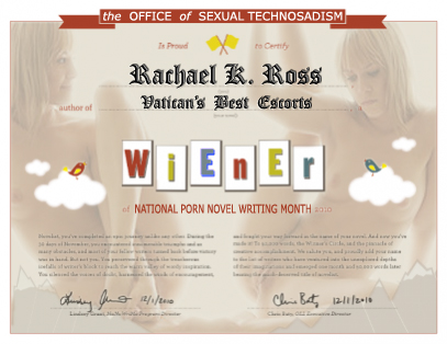 "Write me! Oh fuck yeah! Write my pussy! Write me harder! Deeper! Write! Ugh! Me!"Nov 12th 2010 (432 hours remaining - Word Count: 0)