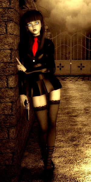 And she stared back down at me as I stood there, my arm straight and holding the gun to her mouth. She looked kinda sexy like that, sucking on it like an evil cock ready to ejaculate her brains all over the civilians behind her. She let go of the big man's leash and the Domme's eyes were red, glowing hot with a lust for hating me.
