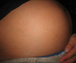 “Well lay down and I’ll do it.” She handed me the bottle of stretch-mark cream and settled full length on the sofa cushions pulling her loose smock up to below breasts and putting her hands above her head. I couldn’t help noticing that the large waist of her pregnancy trousers gaped open as the baby settled higher leaving me a brief view of her white knickers.