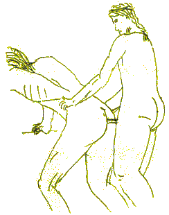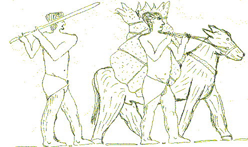 Erdiosh, as all the village knew, liked to suckle on Tektu's penis. Boys do that, of course, but people will say that the boy whose penis is sucked, is usually the brave one. "As penis, so dagger," is the old proverb. No one really thought Tektu was a coward, but Erdiosh thought he had to prove himself to the village, and so he took on the king's warrior, fighting with shields and headless spears. It was horrible. Erdiosh was soon curled up on the ground, shouting "Stop. I'm a coward, a coward" His shoulder was mangled, a rib broken, and there was a bad gash in his groin, bruises all over, and a cut from his own shield below his ear. And he had bitten his tongue. The King's warrior had not been touched. Before walking away, the warrior kicked Erdiosh's bottom.
