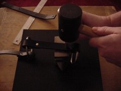 Bend the leather strap through the ring as shown, line up the holes, insert the two halves of the rivet into the holes, set it on the Mini Anvil. and pound the top of the rivet with the Rivet Setter and the Poly Mallet.