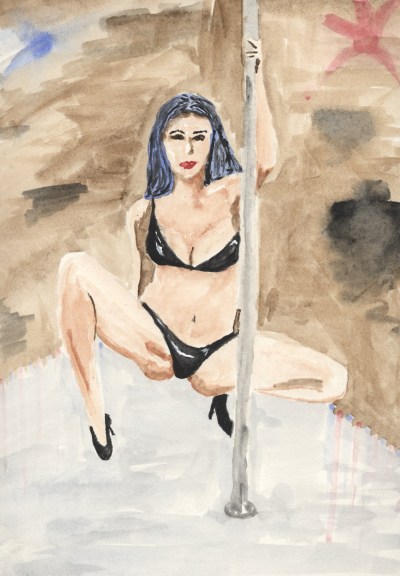 A waitress came by, her breasts swaying braless beneath a white crop top, her black shorts painted on. Kalisha had to shout over the music to order a coke. The policewoman danced and unbuttoned, finally revealing that she was, in fact, wearing a black lacy bra and matching thong.