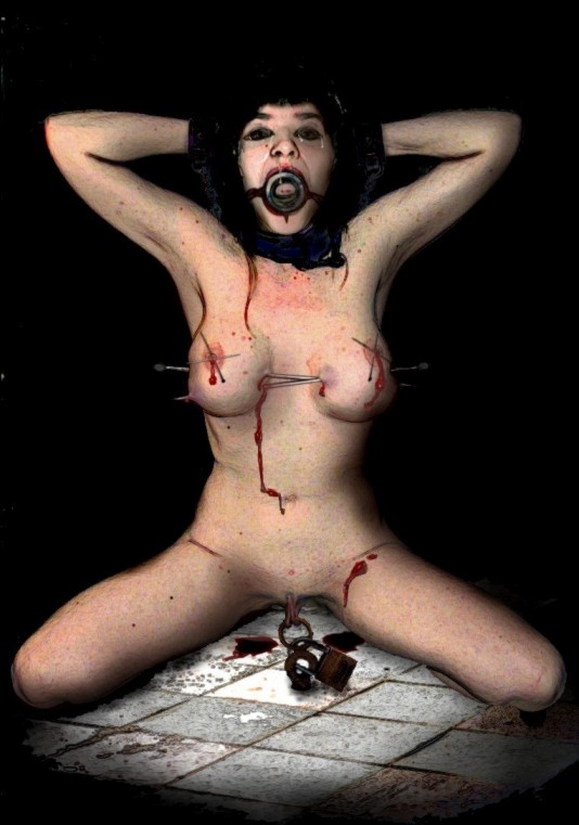 So the full lips of her cunt were pierced with the tip of a bradawl, leaving holes through which large iron rings were driven and welded closed, as she was informed that henceforth, her cunt would not be required, but she would solely satisfy the gentlemen with her arse. And she seemed to care not. So she was taken to the dungeon, so she could not disturb the gentlemen in the clubroom, or sleeping in their rooms, where the ring that pierced her lips was used to padlock her to a ring in the floor. And while she now could not move, lest her lips were torn quite from her body, still she flashed her eyes at the gentlemen, and cursed them roundly. So her arms were shackled behind her head, and the stewards, who were by now rather annoyed with her, as they appeared to not be able to control her, cruelly drove pins through her nipples, and while she screamed and swore at them, and told them of what she would do to them, were she released. Yet still she did not once ask for forgiveness or mercy. And so, nor did they relent; next they drove steel rods through her full tits, this time being as rough as they wished, leting the cruel metal bars tear her skin and the soft inner tissue of her breasts. They cared not at all for her cries, and thrusting them hard through these most sensitive parts of her body, blood leaked from her nipples, since the ducts within had been torn, and where they pierced her from the points of entry and exit, down her waist and to the floor, and this time she most certainly screamed long and loud from their attentions. But still she did not bend to their will.