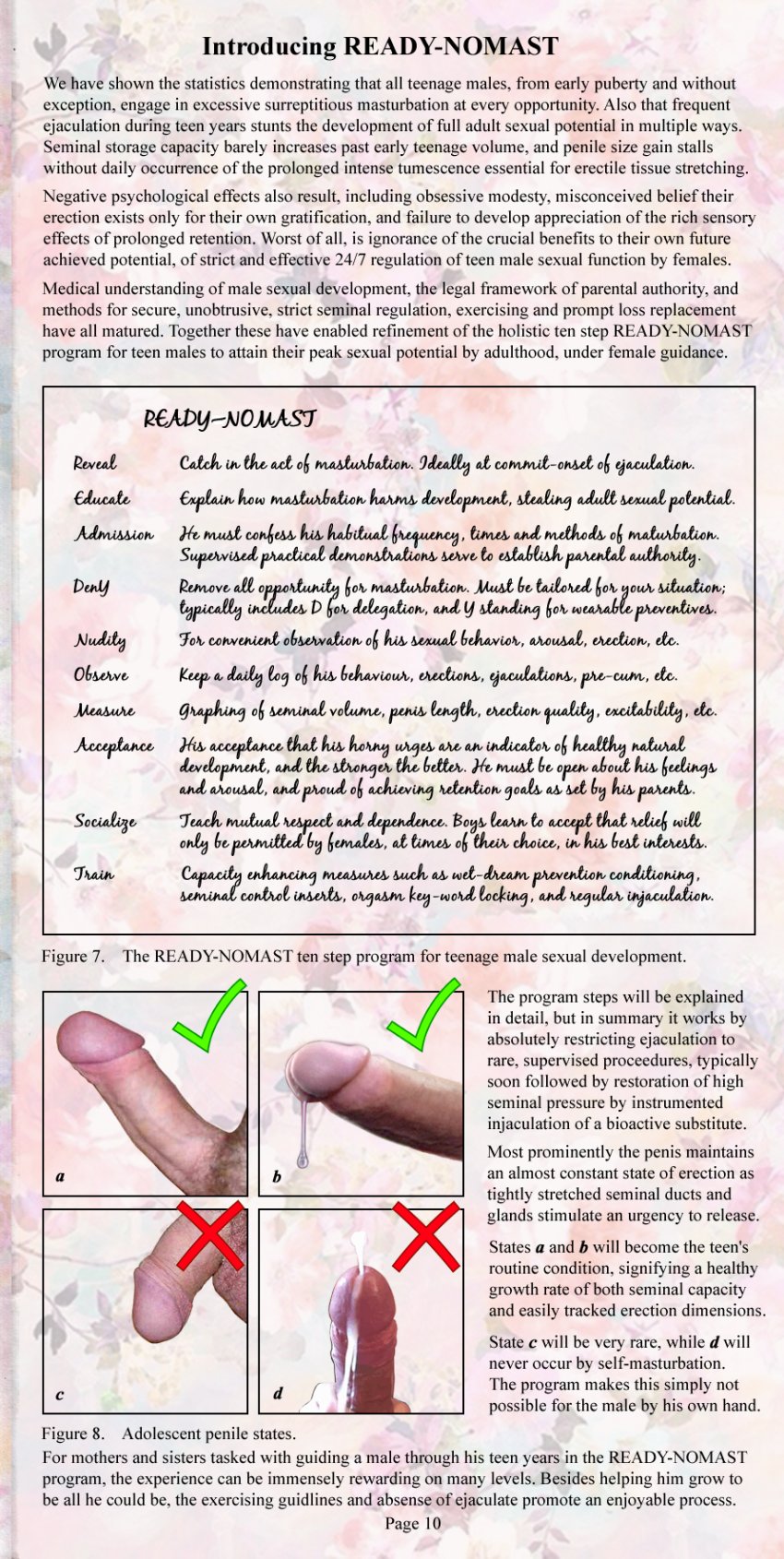 Mrs Wilson starts clapping enthusiastic applause, and the rest of the mothers join in with spirit. "Thank you Beth. That certainly is a stand-out example of the kind of male teen masturbation problems I'm talking about. Don't worry Beth, 17 and even 18 are not hopelessly too late to achieve a turnaround, so long as stern corrective measures are employed. With your determination and the Ready-Nomast program I'm sure you'll achieve a successful outcome. Just as an aside, I'd like to mention that we do also have what we call the 'Late Intervention' program. It's used where a male of 18 to 20 years is discovered to have been heavily masturbating their entire teen years. Resulting in very poor development, and not many years left in which to correct that. The downside is that it does require at least one year of intensive treatment. He must take leave from his school or job, since his ability to focus on non-sexual matters will be greatly reduced for the duration. Hopefully your Francis will not need that, but the contact details are in the back of the brochure should you wish to enquire further. I do think you should have the chip implant and seminal regulation insert done more or less immediately though. Which brings us back to my surprise..."