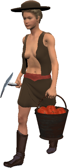 She set down the bucket and slipped under the fence. Crouching to stay out of sight, she snuck up to a tree and carefully pulled down an armload of apples. She quietly moved them to the fence; then returned to pick some more. As soon as she had taken about 30 apples and moved them to the edge of the property, she slipped back under the fence and carefully placed the fruit in her bucket. Trying to stay calm and maintain a neutral expression, she walked back towards the town. Instead of returning to her work site, however, she approached an inn just outside the south gate. She went around to the back where the kitchen was located, looking for a childhood acquaintance who now was working as a serving wench. Danka traded the apples for two copper coins. It was a fair deal with no questions asked. The serving wench needed cheap apples and Danka needed the money. Danka returned to digging site just as her work-mates were waking up. Perfect. Another two coins were safely in her possession.