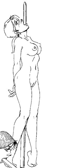 She was unbound, of course, and her hands went to the tip of the rod, trying in vain to lift herself up it. She kicked, one hand sliding to her throat and the other to her belly, fighting to control unimaginable emotions. She kicked, her breasts jouncing madly. She kicked again, her entire body straining, every muscle hard and defined, her nipples standing from her breasts like beautiful pink lemons.