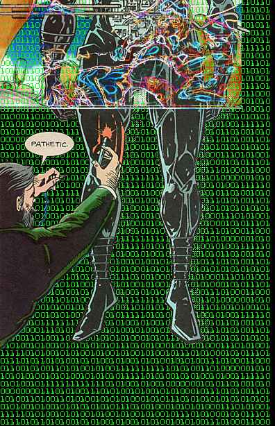 She’s cute, in a frumpy kind of way, an interesting choice here in the Glitterdammerung, where everyone goes for overkill, my humble self included. Black hornrims like a thoughtful folkie and brown hair just soft and wavy enough to want to be touched and the sort of face I guess some folks might call heart-shaped. She’s interestingly dressed for the frumpy look, though: a T-shirt covered in lines of shifting, changing code. And nothing else. That I can see. “Nice shirt,” I say. Nice legs, too. And lovely little feet, with a ring on a toe or three.